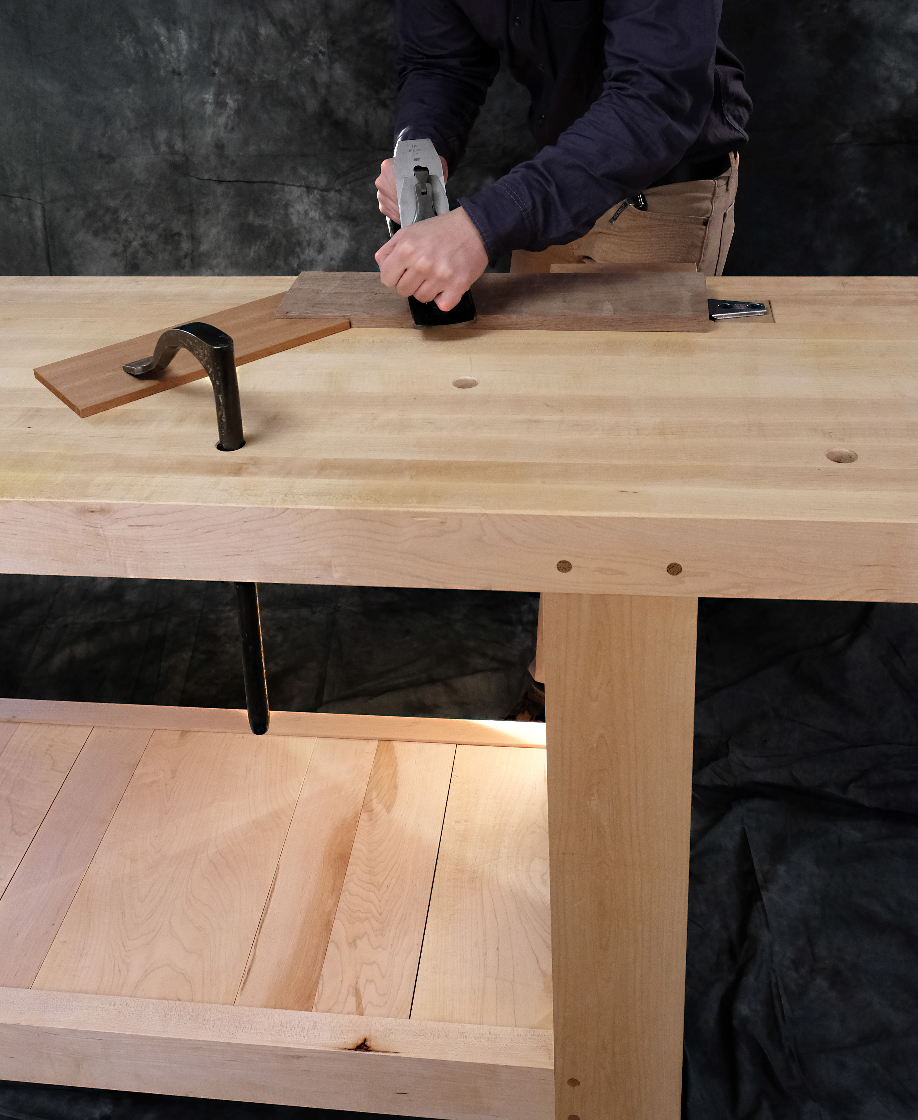 The Classic Workbench is simple to use. The leg vise is used primarily for working the edges of boards and the ends of narrower boards. This is self explanatory. To work the faces of boards along the grain, tap up the planing stop (don’t make it any higher than necessary) and butt the end of the board into the teeth of the stop. With the right technique you can plane across wide boards without repositioning the board. You usually don’t need to tap the opposite end of the board to engage it with the stop, but in some cases, especially with rougher stock, you may need to give a tap with your mallet. Working the faces of a stack of boards is extremely quick with the planing stop since you don’t have to open and close a vise constantly. To work across the face of a board, make yourself a doe’s foot and position it at the back corner of the board, holding it down with a holdfast. The doe’s foot is simply a piece of wood with a V-shaped notch cut into one end. The bottomsurface of the doe’s foot can be lined with sandpaper or Crubber to help it stay put on the bench top. To work long boards, fasten a batten to the right leg with a holdfast and use that to support the end of the long board. We’ve found that a deadman is not necessary for the majority of work, especially on a bench of this length. For working the ends of smaller boards the leg vise can be used, but for precision work like dovetailing, we use and recommend our Moxon Vise.
