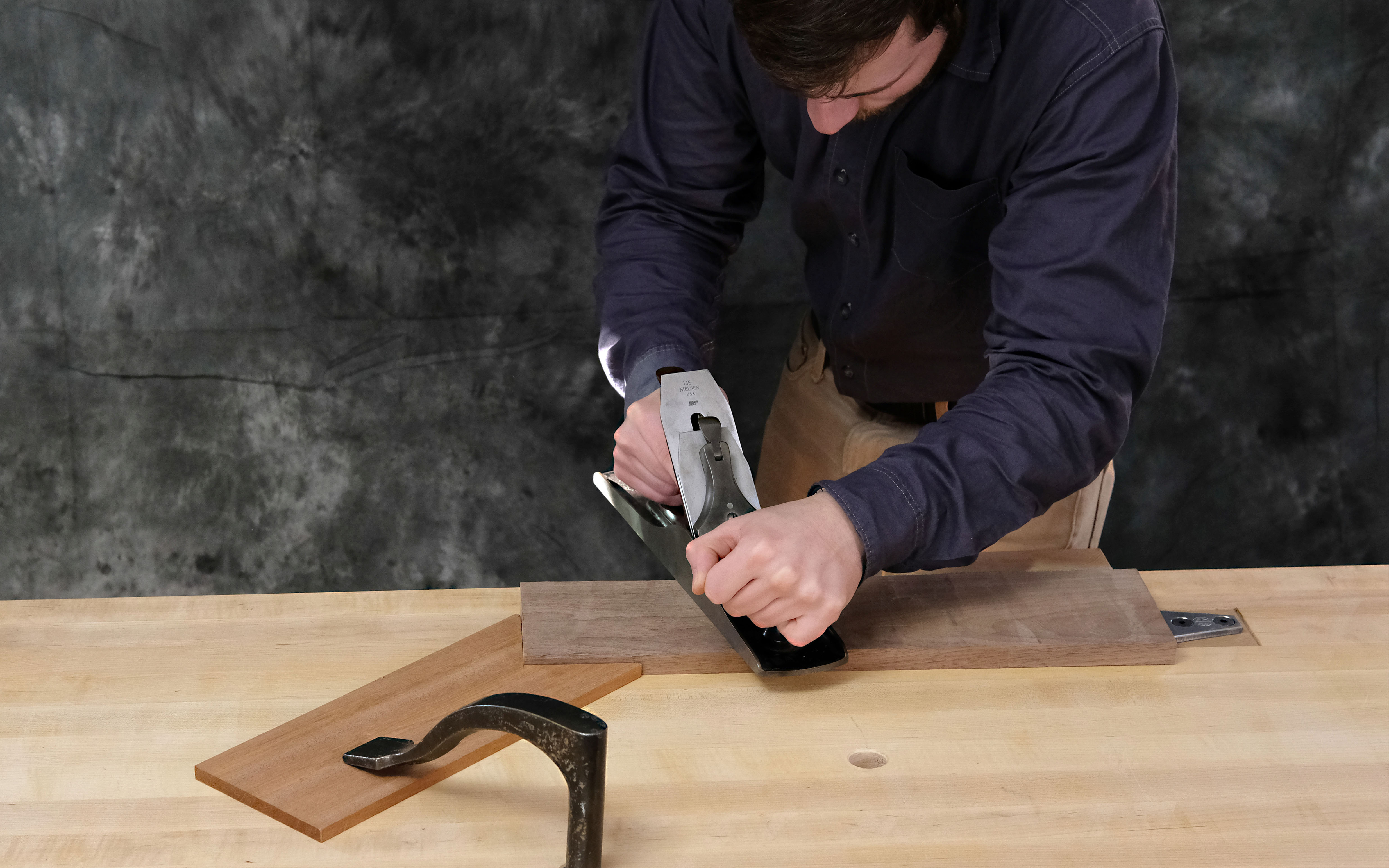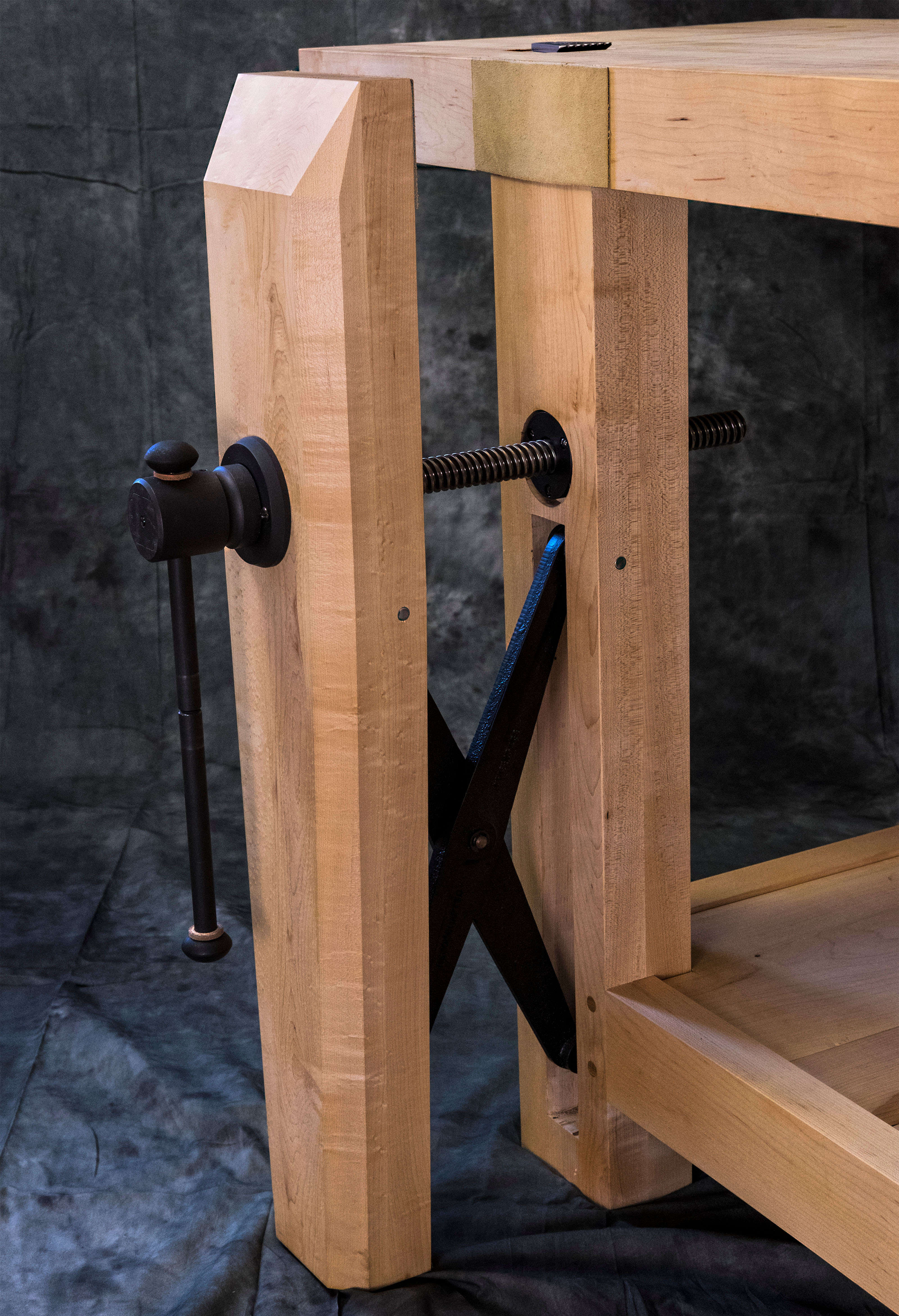 To keep things simple, we’ve outfitted the workbench with only one vise: the Classic Leg Vise. For working the edges of boards, the Classic is a joy to use. For working the faces of boards, our Planing Stop is a quick and efficient way to get the job done, and coupled with a doe’s foot and holdfast you can plane across boards with ease. For working the ends of smaller boards the leg vise can be used, but for larger work like dovetailing, we use and recommend the Moxon vise. For longer edge work, simply attach a batten to the right leg with a holdfast to support the workpiece. We’ve found that a deadman is not necessary for the majority of work, especially on a bench of this length.