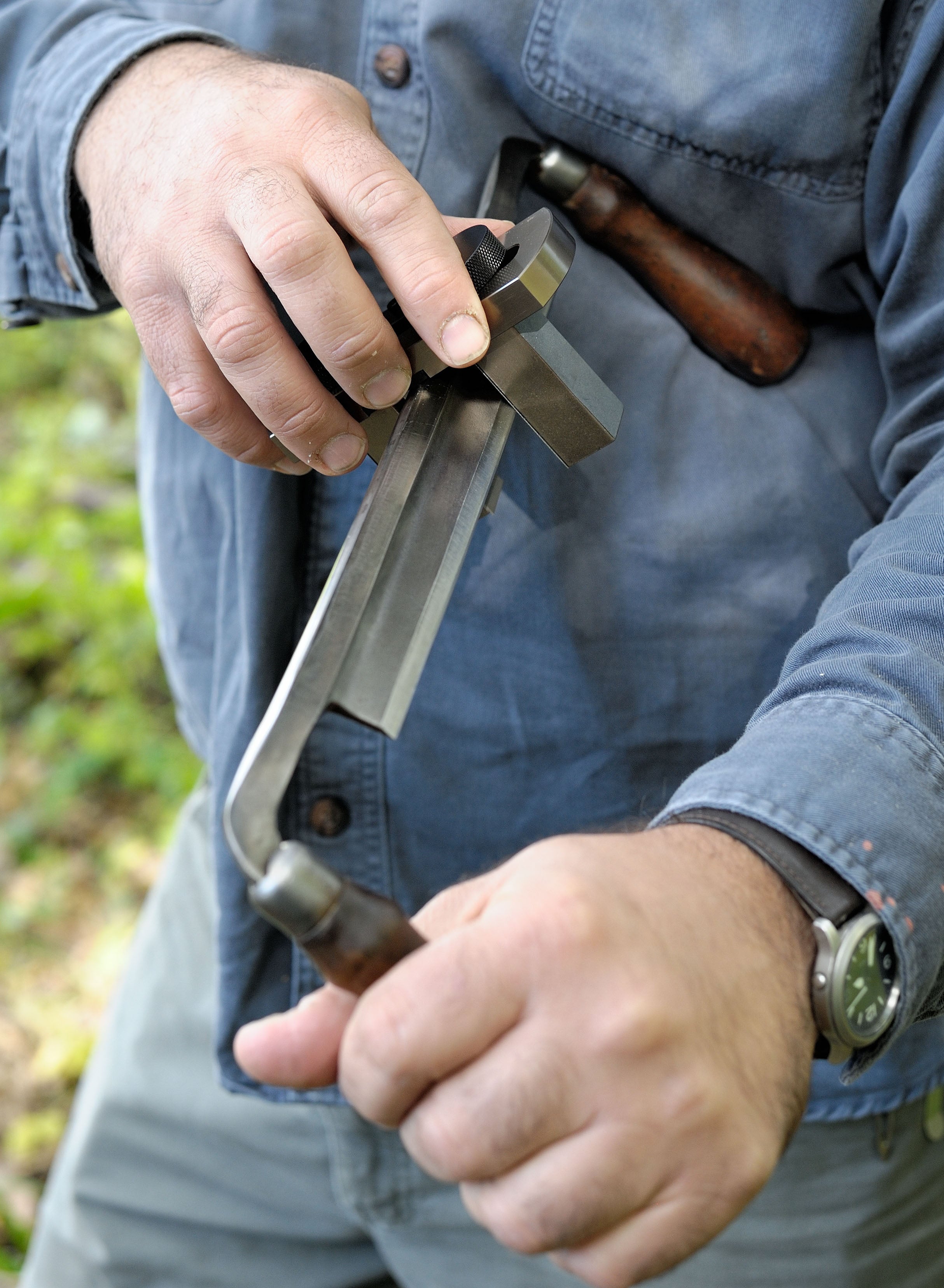 To hone the drawknife, hold it like a violin, then move the Drawsharp up and down the knife with your other hand. You can adjust your grip for your own comfort. You can hold the drawknife palm up or palm down. Whatever feels best to you.