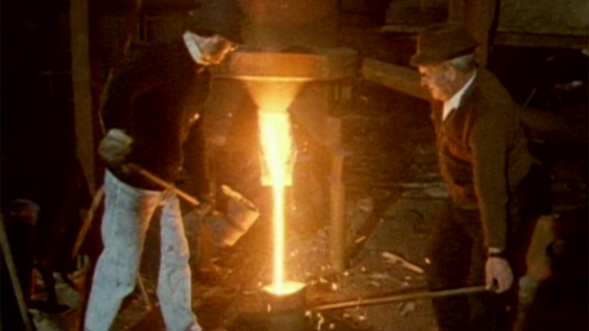 An entertaining and unusual film, it tells the story of the Power family, metal casters from New Ross, Co. Wexford. We follow the process of sand casting a replica of a nineteenth-century, Garden Seat. We also see the weekly cycle of hand-digging marl clay to line the foundry's furnace, the buying in and breaking up of scrap metal for smelting, followed by the high-risk business of pouring the molten metal, over-seen by Mrs. May Power. The documentary is accompanied by music played by the local youth band.