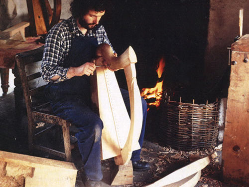 John Surlis's skill as a chairmaker was inherited from his grandfather, a native of Co. Leitrim. Based in the little village of Monasteraden, Co. Sligo, we watch John making a traditional ash wood Leitrim Chair in the slab and stick method. He uses the 'beetle' or cleaver to split the rungs and legs, and shapes them using a drawknife sitting astride his Cooper's Mare. As a versatile craftsman, John also makes traditional donkey straddles & Sugans (twisted straw ropes).