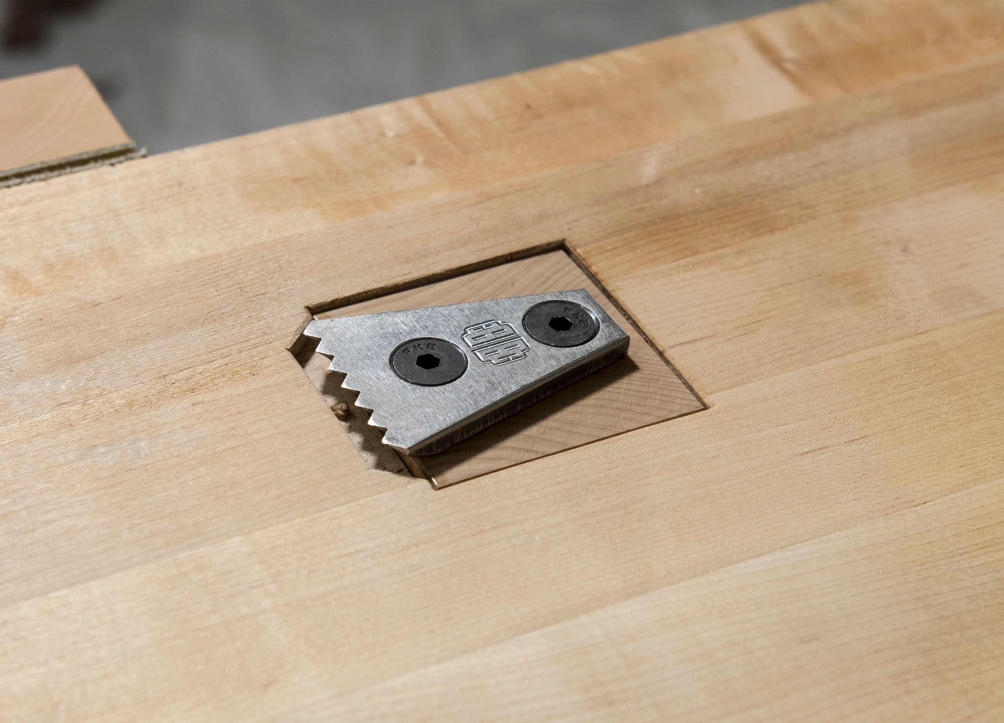 Using the same principle as our Barrel Nuts, the Benchcrafted Planing Stop mounts to the wooden stock via two machine screws and a single, double-tapped barrel nut. This provides excellent holding power and resistance to rotation. It also makes tightening up the stop after seasonal movements a snap. Removing the stop for sharpening is also easy. Just remove the two screws and the stop is free to mount in a vise for filing the 90 degree teeth.