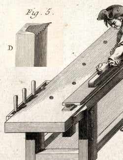 If you prefer to work in a more rudimentary way, a planing stop accompanied by holdfasts and a doe's foot (see fig. 17 from Roubo's Plate 14) can give you excellent workholding. However, if you use routers, the doe's foot/planing stop combo is not useful. And if you carve, a pair of bench dogs will resist movement through 360 degrees. Not so with a planing stop. Obviously we think you should have both a planing stop and a tail vise on your bench, but we're also compelled to be completely practical. If you use hand tools almost exclusively and build more simple forms, or are on a budget, a planing stop will serve you well.